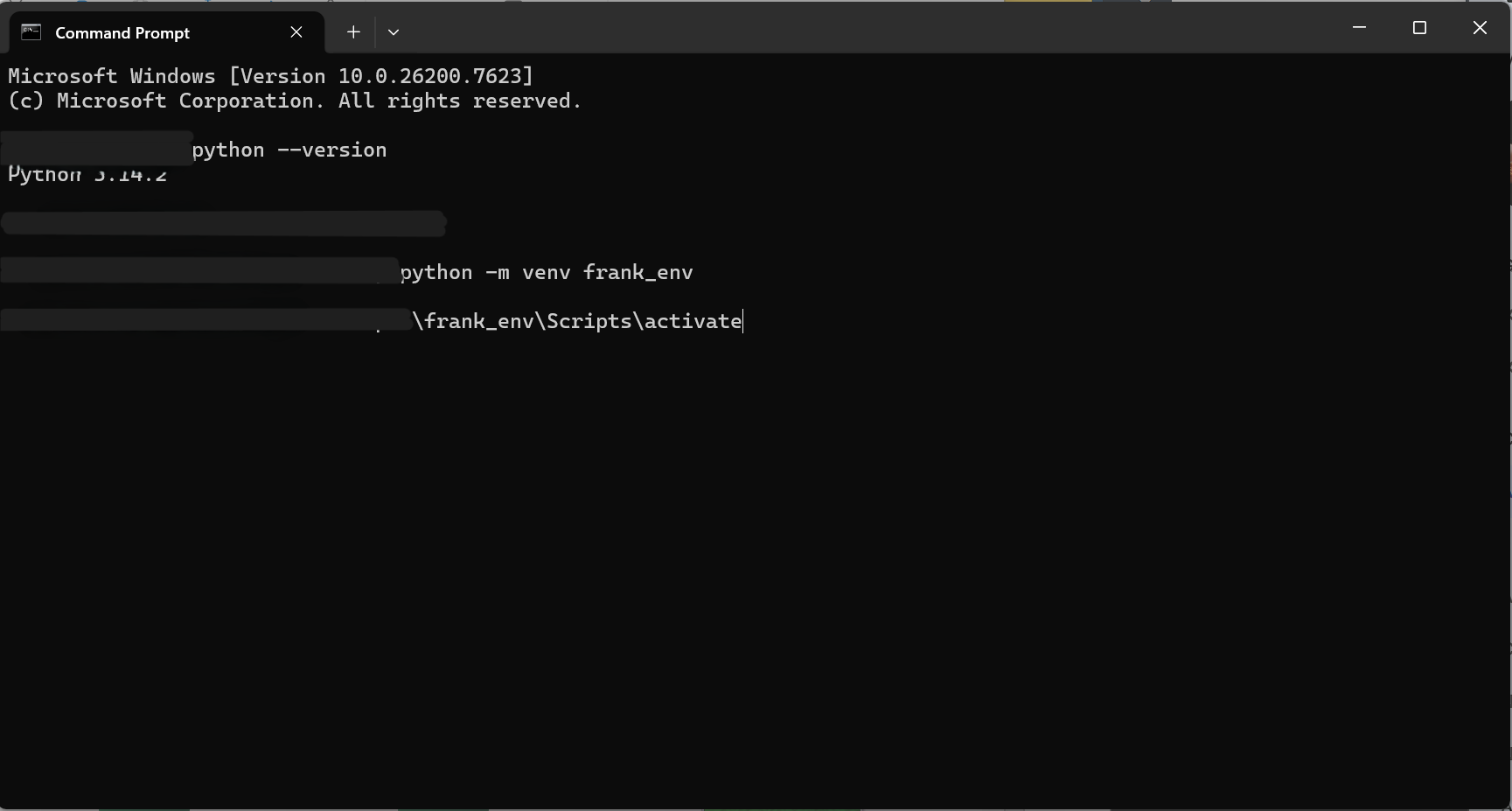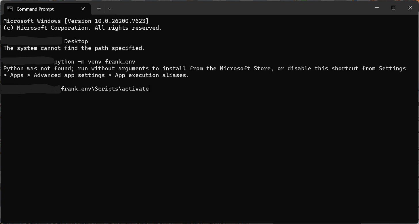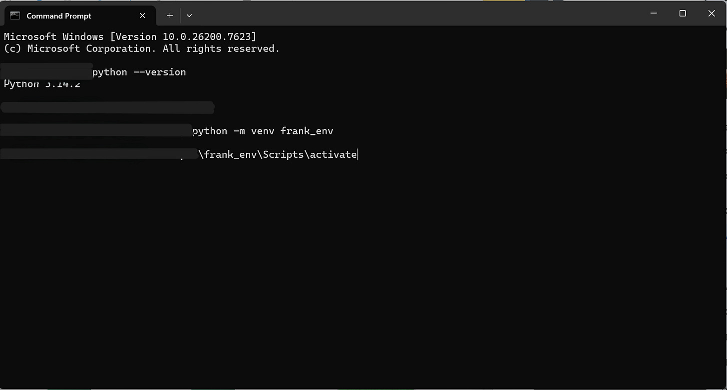 The Hazmat Suit. Running inside a venv keeps your main OS clean. (I’ve blurred my username. Your path will show C:\Users\YourName\OneDrive\Desktop or wherever you saved your project.)